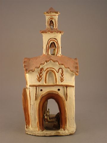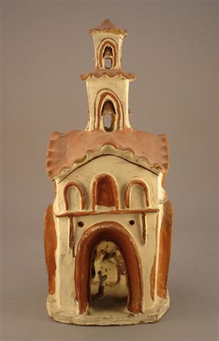 PÉROU. ÉGLISE en terre cuite animée d'une messe et petits personnages. Décor peint ocre et blanc. Haut. 46 cm.