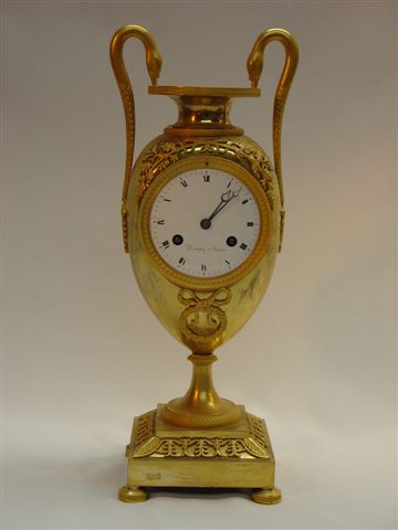 PENDULE en forme de vase ovoïde en bronze doré à décor de guirlande fleurie, rubans et branches de laurier. Anses en col de cygne. Socle orné d'entrelacs et de palmettes.