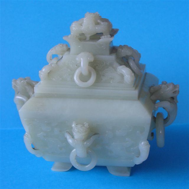 BRÛLE PARFUM quadrangulaire en néphrite blanche à décor sculpté de dragons stylisés sur fond de leiwen, formant masque de taotie. Il est orné ainsi que le couvercle, de chimères supportant des anneaux mobiles.