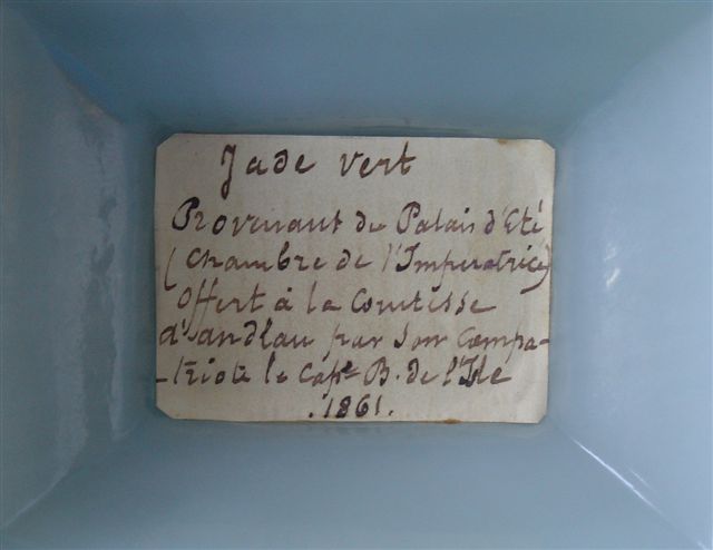 Etiquette ancienne manuscrite daté de 1861, indiquant la nature du présent à la Comtesse d' Andlan, et la provenance " Palais d'Eté, chambre de l'Impératrice" .