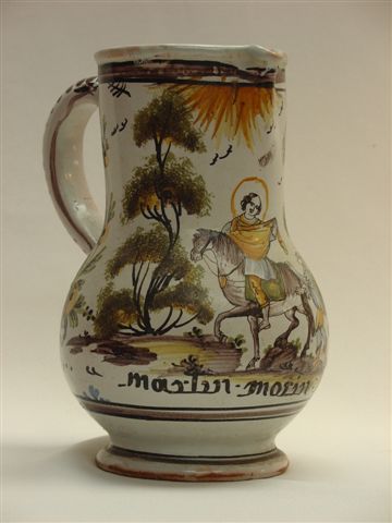 PICHET à eau à fin décor polychrome représentant sur la panse Saint-Martin à cheval , donnant un morceau de son manteau à un mendiant avec les inscriptions, sur la panse :