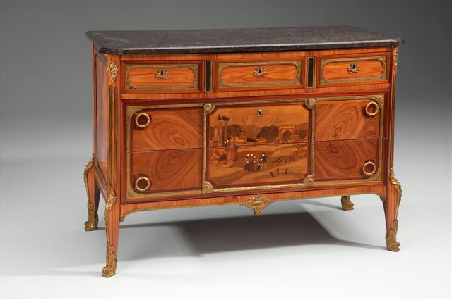 COMMODE rectangulaire en placage à jeu de frisage de bois de rose, satiné, loupe de noyer, houx, charme et os. Elle ouvre à trois rangs de tiroirs dont deux sans traverse et trois en ceinture. Montants à pans coupés cannelés. Piètement cambré. Décor de marqueterie dans un filet d'encadrement : scène animée représentant un groupe de personnages au premier plan, habitations et ruines antiques en arrière-plan. Riche ornementation en bronze doré et ciselé : moulures, perles et rais de coeur d'encadrement, entrées de serrure, rosaces, poignées de tirage en tores de laurier, chutes à médaillons ajourés et enrubannés, cul de lampe au vase godronné et feuillages, sabots à volutes et feuilles d'acanthe. Dessus de marbre gris Saint-Anne.