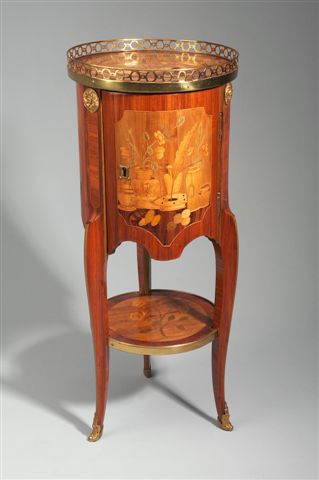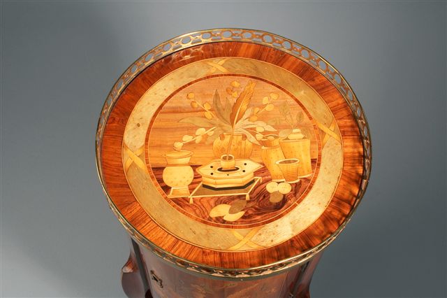 Petite TABLE TAMBOUR en placage de bois de rose, violette, sycomore et bois teinté. Elle ouvre à un vantail dissimulant trois tiroirs marquetés en fil dans des encadrements de fins filets de bois clair. Elle repose sur des pieds cambrés réunis par une tablette. Décor de marqueterie toutes faces : vases fleuris, plume, encrier et pots dans des encadrements de filets. Le plateau présente un médaillon en bois teinté vert à feuilles de laurier retenues par des rubans ; la tablette d'entretoise est marquetée de fleurs. Ornementation en bronze doré et ciselé : galerie à oves ajourées, rosaces, entrée de serrure et sabots.