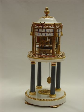 PENDULE TOURNANTE en marbre blanc, soutenue par quatre colonnes en marbre bleu turquin. Belle ornementation en bronze doré : perles, galerie, passementeries.