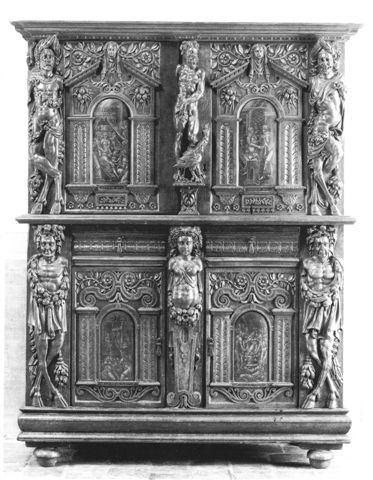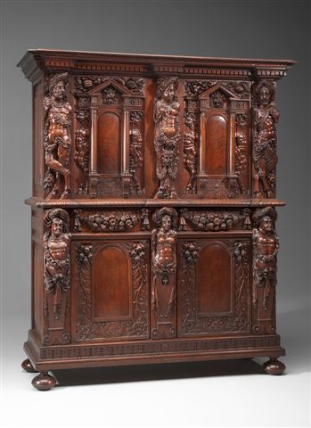 Notre meuble, très architecturé, est à rapprocher des oeuvres d'Hugues Sambin, actif dans la seconde moitié du XVIème siècle. Sambin architecte et ornemaniste, fut également menuisier. Il publia en 1572 "Oeuvre de la diversification des termes dont on se sert en architecture".