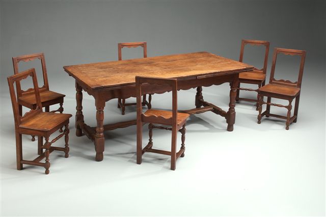 TABLE À TIRETTES "à l'italienne" en chêne, reposant sur des pieds tournés reliés par une entretoise en H, la barre centrale à découpe mouvementée formant des festons est reliée à des barres transversales tournées.
