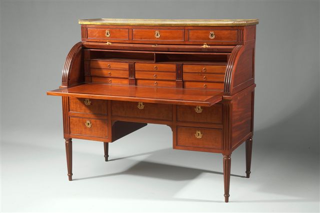BUREAU À CYLINDRE en placage d'acajou moucheté. Il présente trois tiroirs dans la partie supérieure, un cylindre rigide - découvrant tiroirs et casiers - une tablette coulissante intermédiaire, deux caissons latéraux ouvrant à deux tiroirs et un tiroir central. Montants et piètement fuselés cannelés. Ornementation en bronze doré et ciselé : entrées de serrure et poignées à décor de rinceaux, guirlandes et perles. Dessus de marbre blanc à galerie.