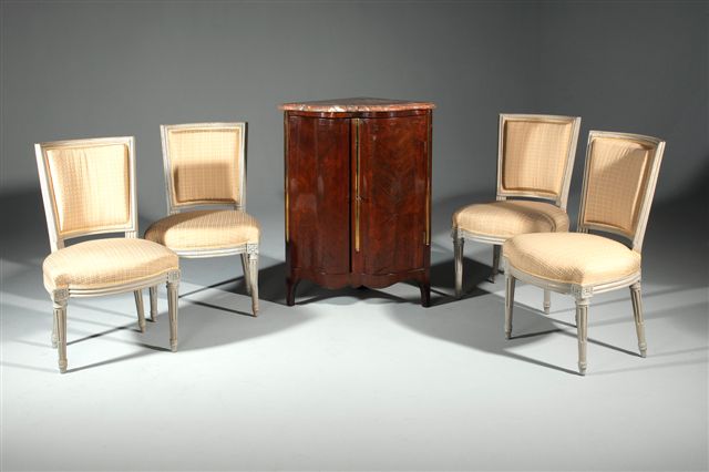 SUITE DE QUATRE CHAISES à dossier cabriolet en hêtre mouluré relaqué gris. Dossier tuile. Pieds fuselés cannelés rudentés.