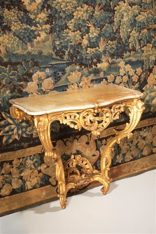 CONSOLE D'APPLIQUE en bois mouluré redoré et sculpté de volutes rocailles et quadrillages. Ceinture ajourée de guirlandes de fleurs. Deux montants sinueux à décor d'acanthes réunis par une entretoise. Dessus de marbre blanc mouluré.