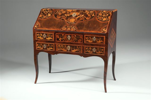 BUREAU DOS D'ÂNE, dit secrétaire en pente, en placage de palissandre, bois de rose, olivier et sycomore. Il ouvre à un abattant - découvrant quatre petits tiroirs à doucine, casiers et tiroir secret - et cinq tiroirs dans la partie inférieure. Traverse inférieure mouvementée. Piètement cambré. Riche décor de marqueterie : bouquet et guirlandes fleuris, oiseau en réserve dans des encadrements de filets. Entrées de serrure en bronze doré et ciselé à décor Rocaille.