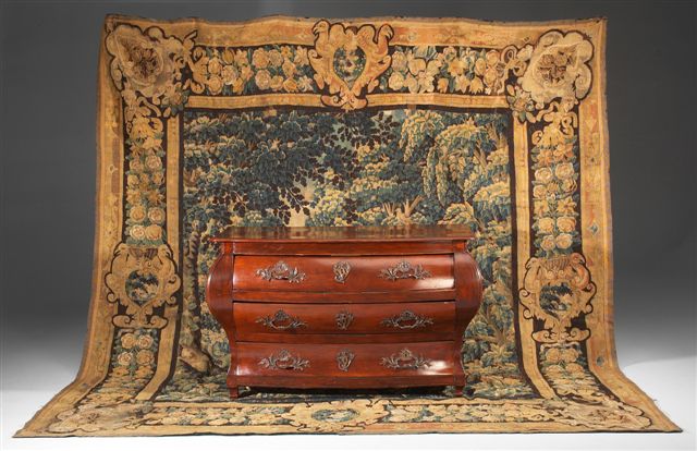 COMMODE en bois fruitier de forme galbée, présentant façade et côtés fortement bombés dans la partie supérieure. Elle ouvre à trois rangs de tiroirs. Ornementation en bronze à décor de feuillage et Rocaille : poignées de tirage, entrées de serrure.