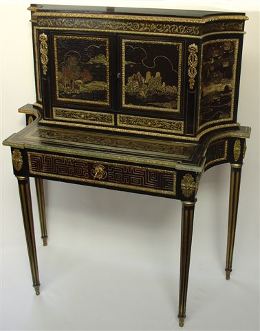 Le gradin ouvre à deux vantaux et à deux tiroirs dans la partie inférieure. Il ouvre à un tiroir en ceinture découvrant une tablette coulissante recouverte de cuir - et repose sur un piètement cannelé. Décor sur fond laqué d'inspiration japonaise : paysage montagneux, arbres, habitations, temples, murailles et motifs stylisés. Ornementation en bronze : arabesques, fleurs et filets en incrustations, frises de laurier, oves et rinceaux en encadrement, feuillages stylisés en appliques, moulures, entrées de serrure et sabots.