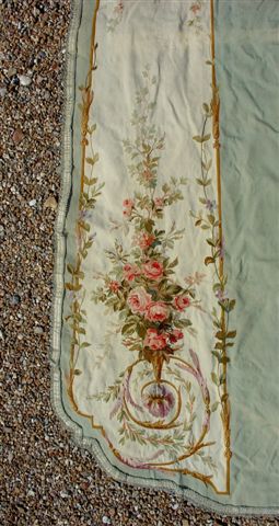 PORTIÈRE à décor de bouquets de roses épanouis et instruments de musique. cartouche central avec carquois de flèches. Entrelacs, arabesques et branchages.