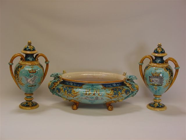 Garniture de cheminée composée d'une jardinière ovale à anses en griffons terminées en corolles de feuillage, et pieds en volutes ; et d'une paire de vases couverts sur piédouche, à col étroit et double anses détachées. Sur l'émail turquoise de la jardinière, figurent, sur une face la salamandre couronnée, et sur l'autre les initiales "B.M." surmontant un ruban daté du "14 mars 1926", le tout entouré de rinceaux ocres sur fond bleu plus sombre. On retrouve ce même décor de rinceaux en encadrement sur les vases ornés des emblèmes souverains blésois sur fond turquoise : porc-épic et salamandre d'une part, cygne et hermine d'autre part.