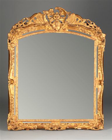 GLACE rectangulaire à double encadrement en bois et stuc doré. Fronton et contours à décor sculpté au répertoire iconographique Louis XV : fleurs, feuilles d'acanthe, Rocaille et rinceaux.