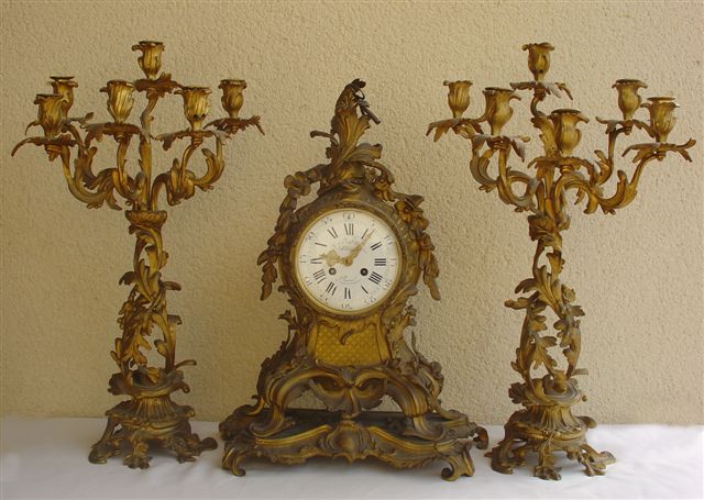 GARNITURE DE CHEMINÉE trois pièces en bronze doré et ciselé, de forme mouvementée, à décor rocaille d'enroulements, feuilles d'acanthe, fleurs et volutes feuillagées, comportant : un cartel juché sur un socle feuillagé. Cadran signé "Mon Auguste Lemaire, E. Lohse Sucr, Paris, rue Vieille du Temple, 121" et une paire de candélabres.
