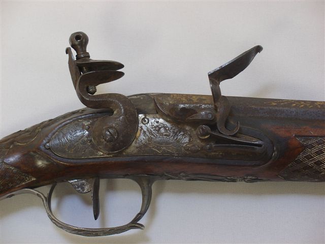 Canon rond, évasé vers la bouche, à pans au tonnerre, gravé et doré à la moitié. Platine et chien col de cygne à corps rond, gravés d'attributs militaires. Ressort à roulette. Garnitures en argent découpé, ciselé et gravé. Crosse et fût en noyer à quadrillage vannerie, décoré sur le fût d'incrustation de fils en argent.