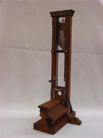 Pièce originale portant l'inscription "1887", sur l'embase du montant gauche, d'où supposition de la date de réalisation; restaurée en 1998 (rainures guide, couteau, visserie remplacés).