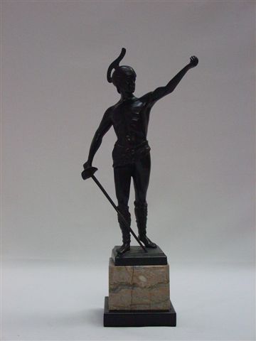 Soldat antique. Bronze à patine noire. Signé. Socle en marbre rose. Haut. 36 cm.