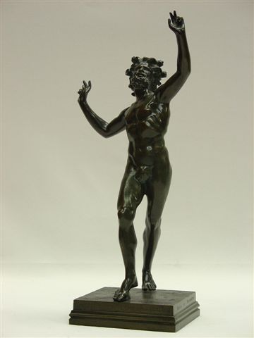 "Faune dansant", d'après l'original découvert à Pompéï et conservé au musée de Naples. Bronze à patine vert antique. Inscriptions sur le socle "A Renée Richard 12 novembre 1881 A. C.", "Aïda, Prophète", "Favorite, Hamlet". XIXème siècle. Haut. 31 cm.