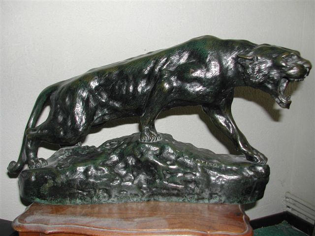 Fauve rugissant. Bronze patine vert antique. Signé. Haut. Long. cm