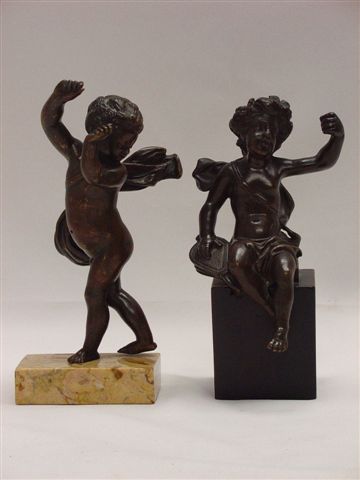 Deux Amours dont un au soufflet. Bronzes à patine médaille. Socles en bois et marbre. Haut. 19 cm.