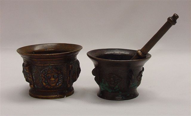2 mortiers et un pilon en bronze à décor de mascarons stylisés. Haut. 9, Diam. 12,5 cm.