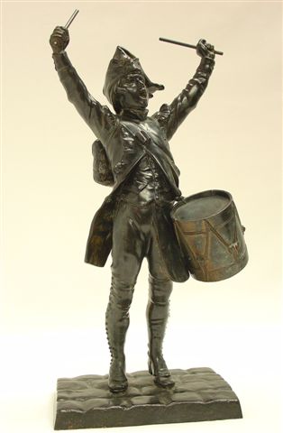 "Le jeune tambour". Métal composite à patine noire. Signature peu lisible sur la terrasse à droite. Haut. 43 cm.