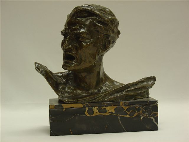 Buste d'homme. Bronze à patine mordorée. Signé. Socle en marbre noir brèche. Haut. 30, Long. 25 cm.