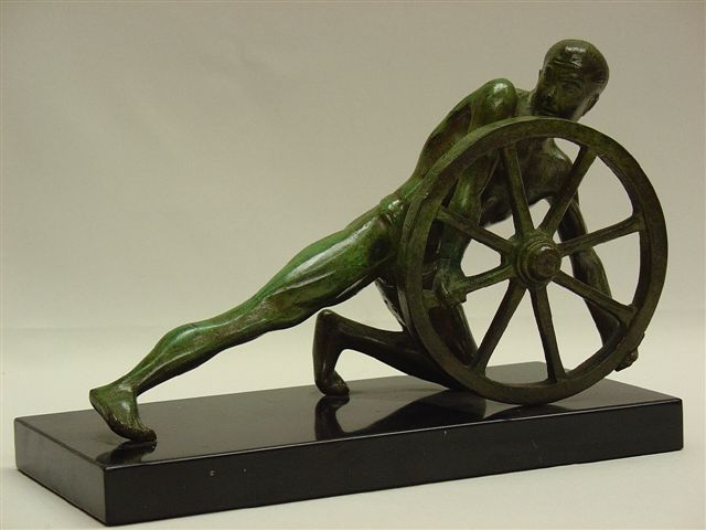 L'homme à la roue. Bronze à patine verte. Signé. Socle en marbre noir. Haut. 20, Long. 27 cm.
