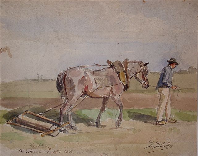 Le paysan travaillant au champs. Aquarelle. Située et datée en bas à gauche "La Main Ferme en Sologne (Loiret), 1875". Signée en bas à droite. 27 x 34 cm.