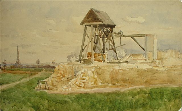 Un forage près de Paris. Aquarelle. Signée en bas à gauche.