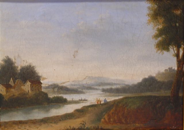 Paysage à la rivière. Sur sa toile d'origine. 16 x 21,5 cm. (Accidents).