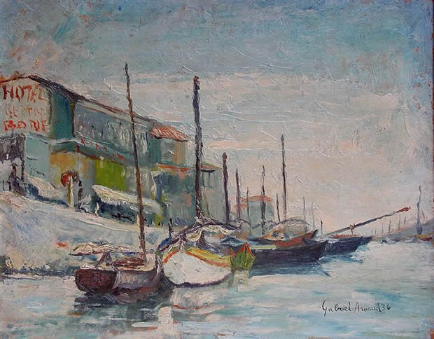 Un port. Huile sur panneau. Signée et datée en bas à droite, 1936.