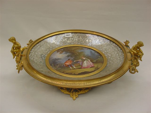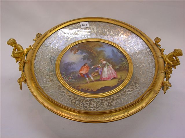 COUPE en bronze doré au répertoire iconographique du XVIIIème : anses feuillagées de pampres aux Amours, piètement, entrelacs et carquois de flèches. Le pourtour serti d'un verre (accdt) est en argent filigrané d'arabesques. Plaque de porcelaine centrale représentant en médaillon circulaire : une bergerade dans le goût de Watteau. Signé : Maison Alph. GIROUX à Paris. XIXème siècle.