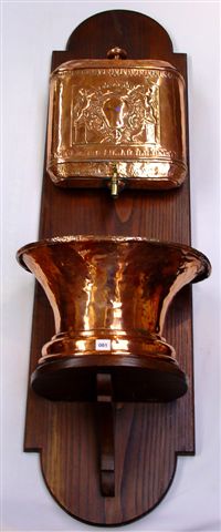 FONTAINE en cuivre à décor repoussé d'amours enserrant un cartouche couronné et de frises de feuilles d'acanthe, robinet en bronze, et son BASSIN évasé en cuivre, intérieur étamé, XIXème. Fontaine : Haut. 38, Larg. 31 cm. Bassin : Haut. 21, Larg. 37 cm. Support en bois (moderne).