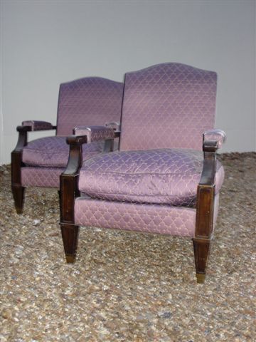 SALON 3 pièces : CANAPÉ 3 places, et PAIRE de FAUTEUILS assortis ; ébenisterie en noyer verni ton palissandre, dossier garni à tableau, avec sabots dorés. Satin uni mauve, brodé motifs géométrisés paille. Modèle DEC. 44.