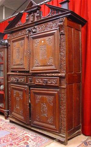 BUFFET DEUX CORPS en chêne sculpté. Fronton triangulaire à décor sculpté d'une Vierge à l'Enfant entouré de deux têtes d'angelot et de rinceaux ajourés, le tout surmonté d'éléments architecturaux. Elle ouvre par quatre vantaux ornés au centre de personnages et de paniers fleuris, et de rinceaux dans les quatre angles. Ils sont séparés par des ornementations sculptées d'angelots, branchages fleuris et frises feuillagées. A la partie médiane, un rang de 3 tiroirs orné de paniers fleuris, têtes d'angelots et guirlandes feuillagées. Fronton triangulaire à décor de deux angelots élevant une couronne. En partie du XVIIème siècle. Haut. 253, Larg. 179, Prof. 57 cm.