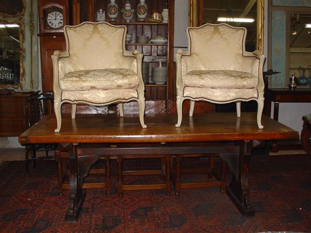 GRANDE TABLE en bois naturel, dans le goût Italien, à deux pieds découpés sur patins reliés par une traverse. le plateau est formé de deux morceaux reliés par des embouts chevillés. A l'extérieur les deux pieds sont ornementés par deux motifs ronds décoratifs.