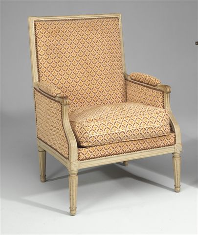 Large BERGÈRE à dossier plat rectangulaire en hêtre mouluré et relaqué crème. Pieds fuselés cannelés. Estampillée P. LANGLOIS.