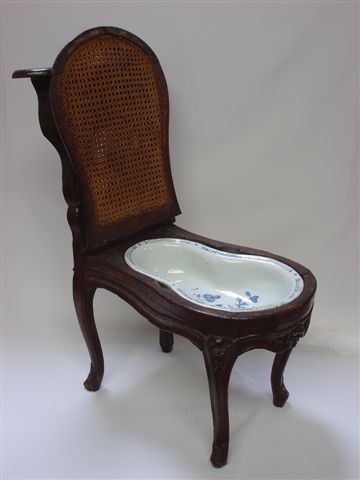 BIDET canné en bois naturel mouluré et sculpté de fleurettes ; pieds cambrés terminés par un feuillage. Estampillé AMAND. Poinçon de jurande JME. Louis XV. Henri AMAND reçu Maître le 17 novembre 1749. Avec son intérieur en faïence de Rouen bleu et blanc du XVIIIème siècle. Haut. 79,5, Prof. 53,5 cm.