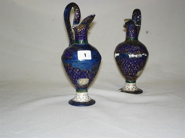 Rare paire d'AIGUIÈRES en émail : bleu, vert, blanc et or. Travail ancien, accidents et restaurations. Haut. 18 cm.