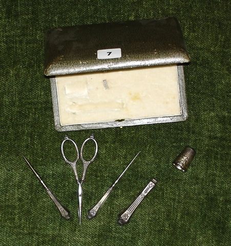 NÉCESSAIRE DE COUTURE en argent et acier comprenant des ciseaux à broder, dé à coudre, étui à aiguilles, poinçons et passe-lacets. Coffret. 14 x 10 cm.