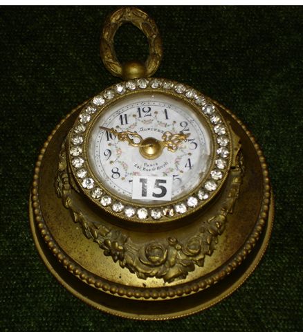 MONTRE-CARTEL d'applique en bronze doré et ciselé. Décor de guirlande de fleurs, ruban, perles et noeuds. Entourage de pierres blanches. Cadran émaillé à décor de fleurettes, signé Ed. Gleizes Paris 240, rue de Rivoli. Style Louis XVI. Diam. 9 cm.