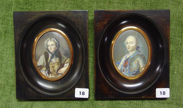PAIRE DE MINIATURES peint sur ivoire, représentant Louis XV et Marie Leszczynska. (accident à l'une). Haut. 8,5 cm.