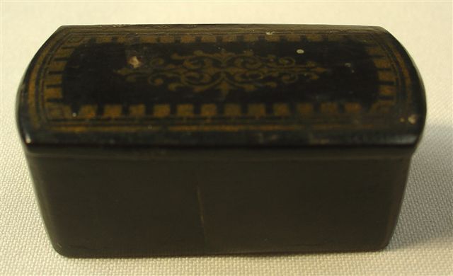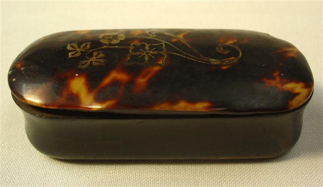 TABATIÈRE, de forme ovale, en corne et couvercle en écaille de tortue (pet. mque). Décor floral en cuivre. Haut. 2, Long. 7,5, Larg. 3,5 cm. Joint 2 TABATIÈRES, de forme ovale, en corne et bois peint.