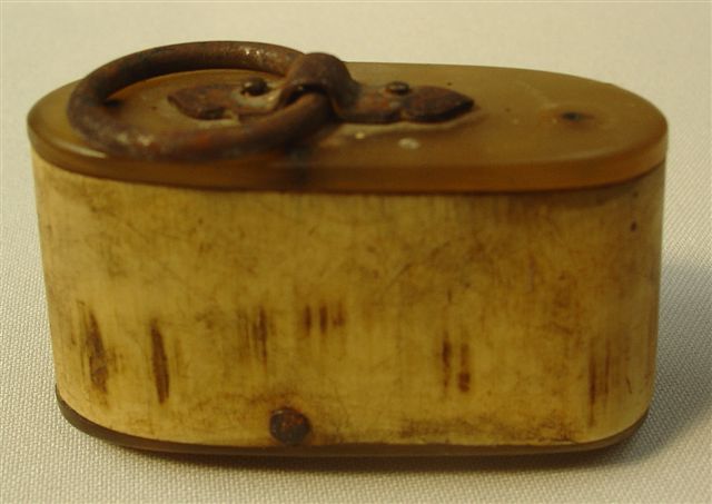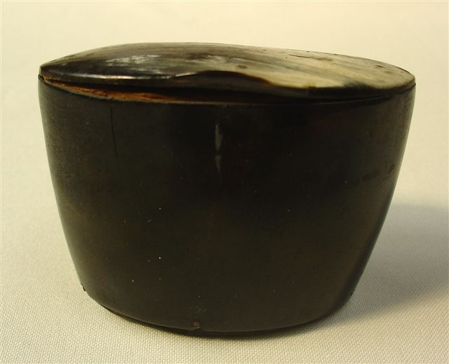 3 TABATIÈRES oblongues : tabatière en corne brune. Haut. 6, Long. 7 cm ; tabatière en corne claire, couvercle à anneau. Haut. 3,5, Long. 5,5 cm ; tabatière en corne claire et os, couvercle à anneau. Haut. 3,5, Long. 6 cm.