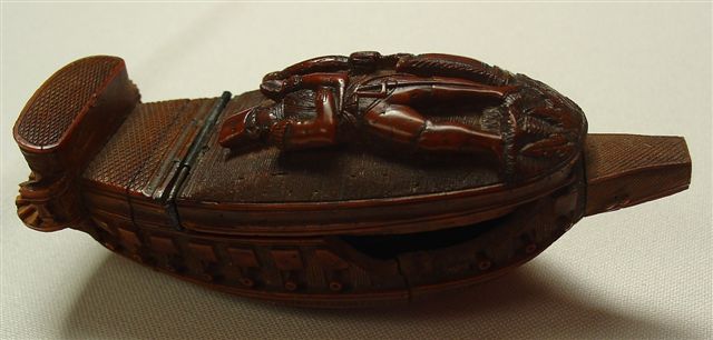 TABATIÈRE en noix de corozo, en forme de navire, à décor sculpté sur le couvercle représentant Napoléon Bonaparte et un aigle aux ailes déployées. Le pourtour représente une coque de vaisseau ornéede canons et baptisée "Flore". Début XIXème. Haut. 3,5, Long. 9,5, Larg. 4 cm. (accdts et mques)