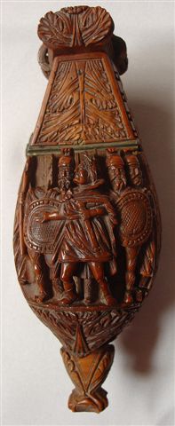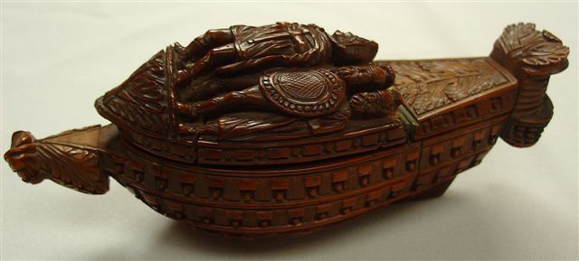 TABATIÈRE en noix de corozo, en forme de navire, à décor sculpté sur le couvercle d'une scène figurant un empereur romain entouré de soldats armés de lances et boucliers. Le pourtour et le fond sculptés représentant une coque de vaisseau armée de canons et ornée coquillages et feuillages stylisés. XVIIIème-XIXème. Haut. 5,5, Long. 15, Larg. 6 cm. (mque)