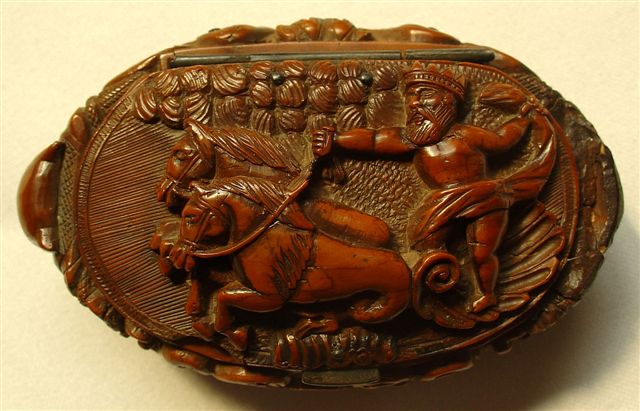 TABATIÈRE en noix de corozo, de forme ovale, à décor sculpté sur le couvercle de Neptune jaillissant armé de son trident, sur un char tiré par des monstres mi-cheveux, mi-serpents. Le pourtour et le fond sculptés d'entrelacs, mascarons et écusson. XVIIIème-XIXème. Haut. 4, Long. 8, Larg. 5 cm. (accdts et rest.)